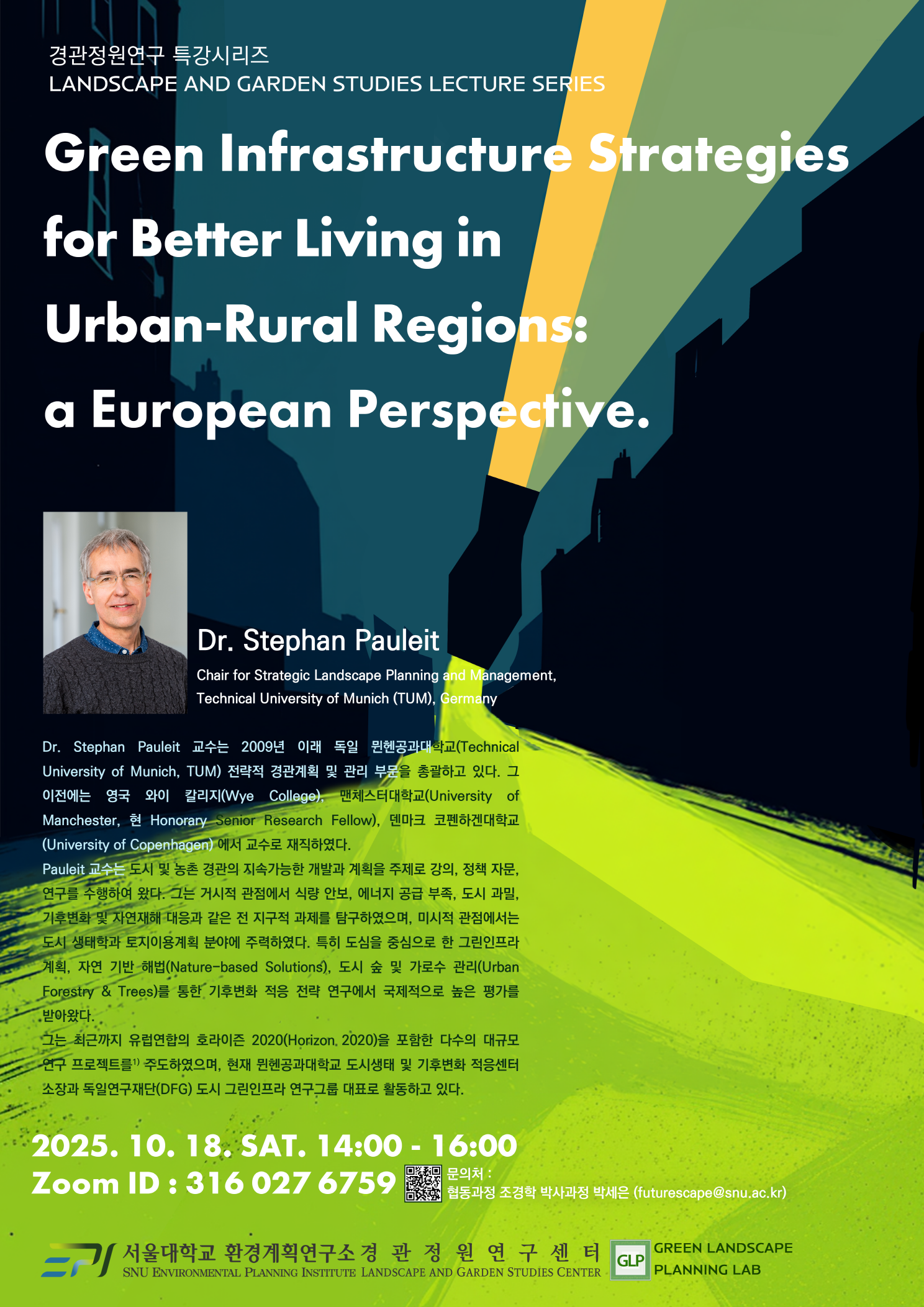 서울대학교 환경계획연구소 경관정원센터 • 조경계획연구실에서 뮌헨 공대의 Dr. Stephan Pauleit를 모시고 특별 강연을 준비했습니다.