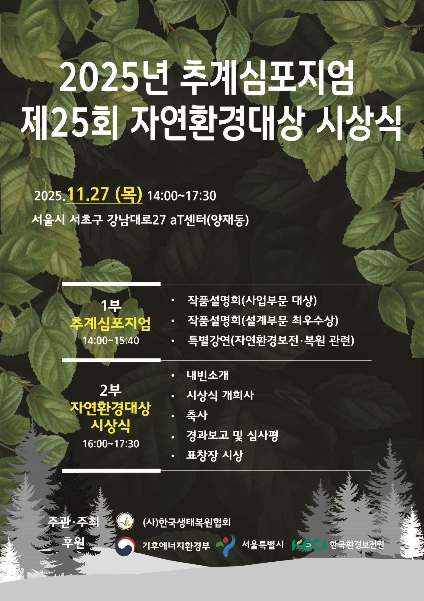 [11/27] 한국생태복원협회 2025 추계심포지엄 및 제25회 자연환경대상 시상식 개최 안내