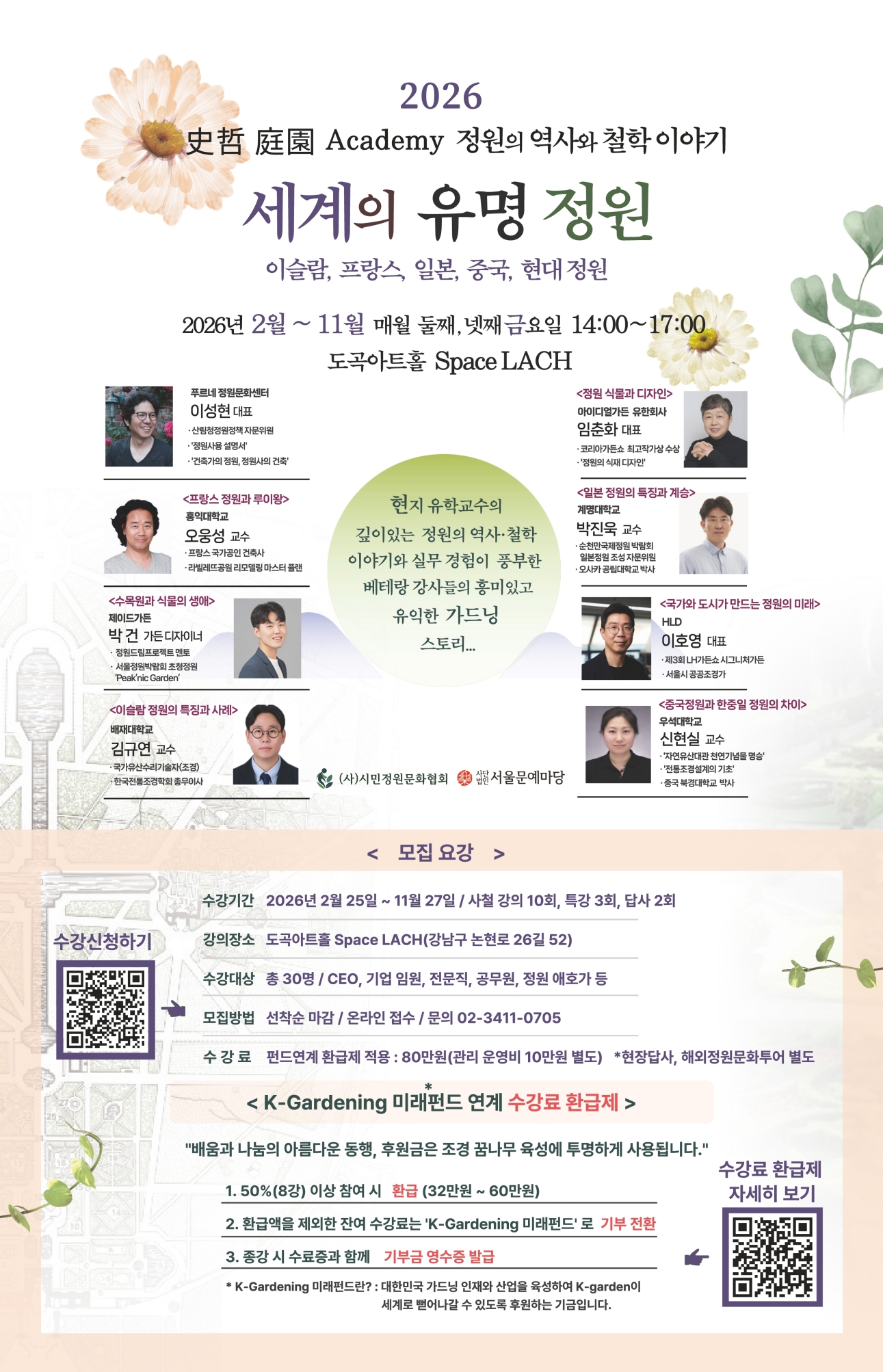 2026년에는 프랑스 정원, 이슬람 정원, 일본 정원, 중국 정원의 역사와 철학을 차례로 탐구하며, 강의뿐 아니라 전통 한국정원 답사와 최근 조성된 ‘꼭 가봐야 할 정원’ 현장 방문도 함께 진행합니다.