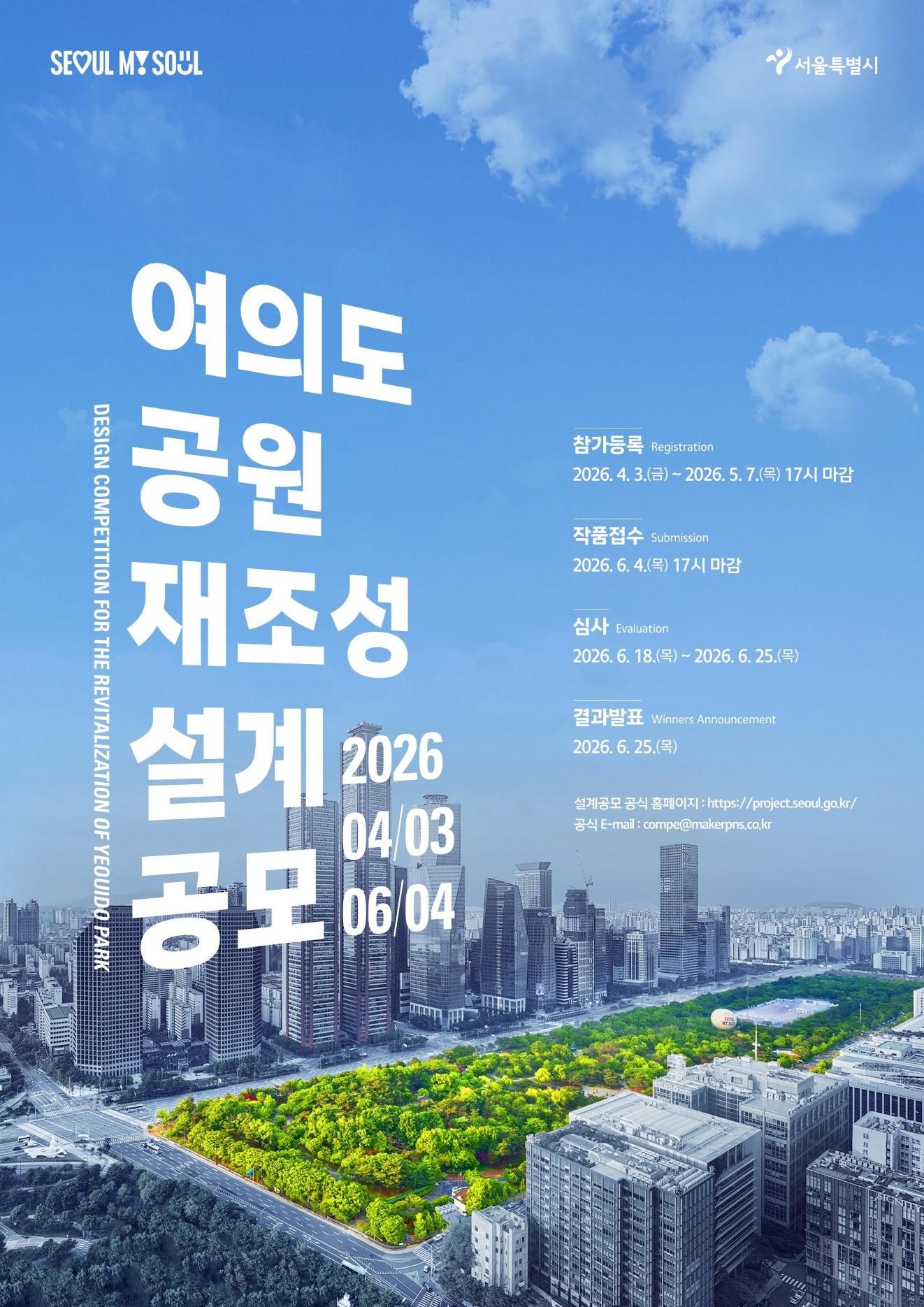 아래와 같이 [여의도공원 재조성 설계공모] 안내 드립니다. 자세한 사항은 첨부파일 및 포스터를 참조하여 주시기 바랍니다.
