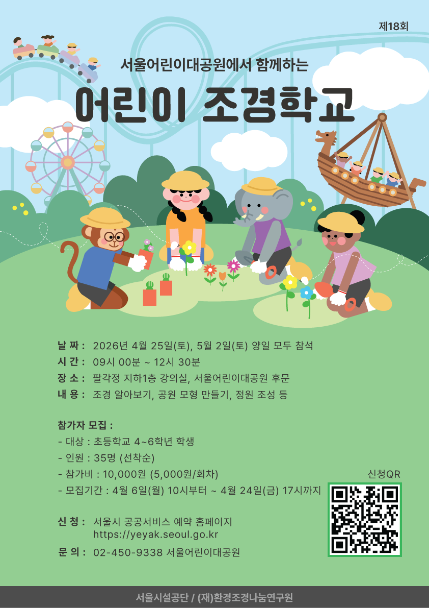 아래와 같이 [환경조경나눔연구원 어린이조경학교 참가자 모집 및 운영] 안내 드립니다. 자세한 사항은 포스터를 참조하여 주시기 바랍니다.