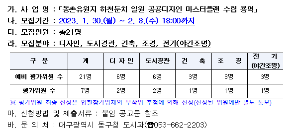 [공개모집 및 위원추천 ~02/08] 「동촌유원지 하천둔치 일원 공공디자인 마스터플랜 수립 용역」 제안서 평가 위원 공개모집 및 추천