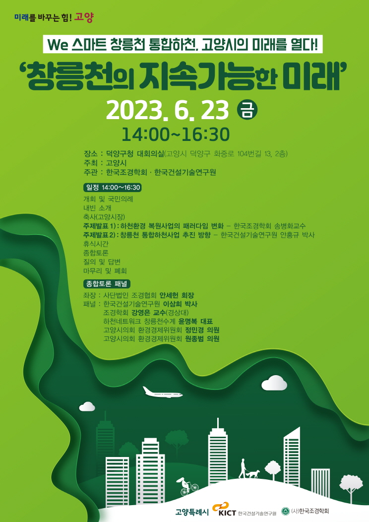고양시가 주최, 한국조경학회 ‧ 한국건설기술연구원이 공동 주관하는 '창릉천의 지속가능한 미래'심포지움이 아래와 같이 개최됩니다.