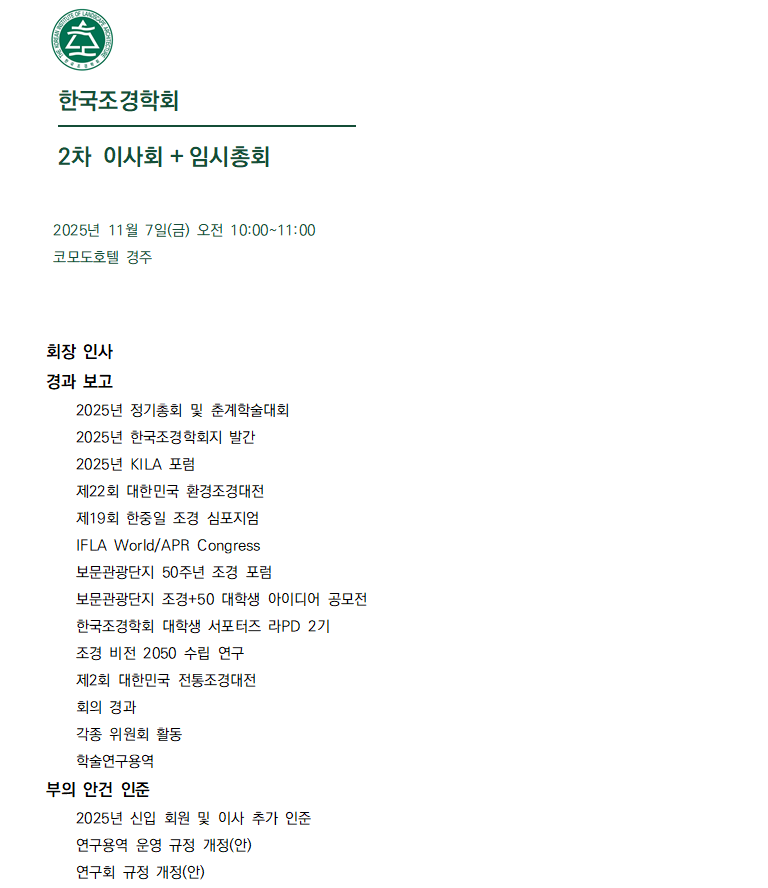 ◦ (사)한국조경학회 2025년 제2차 이사회 및 임시총회