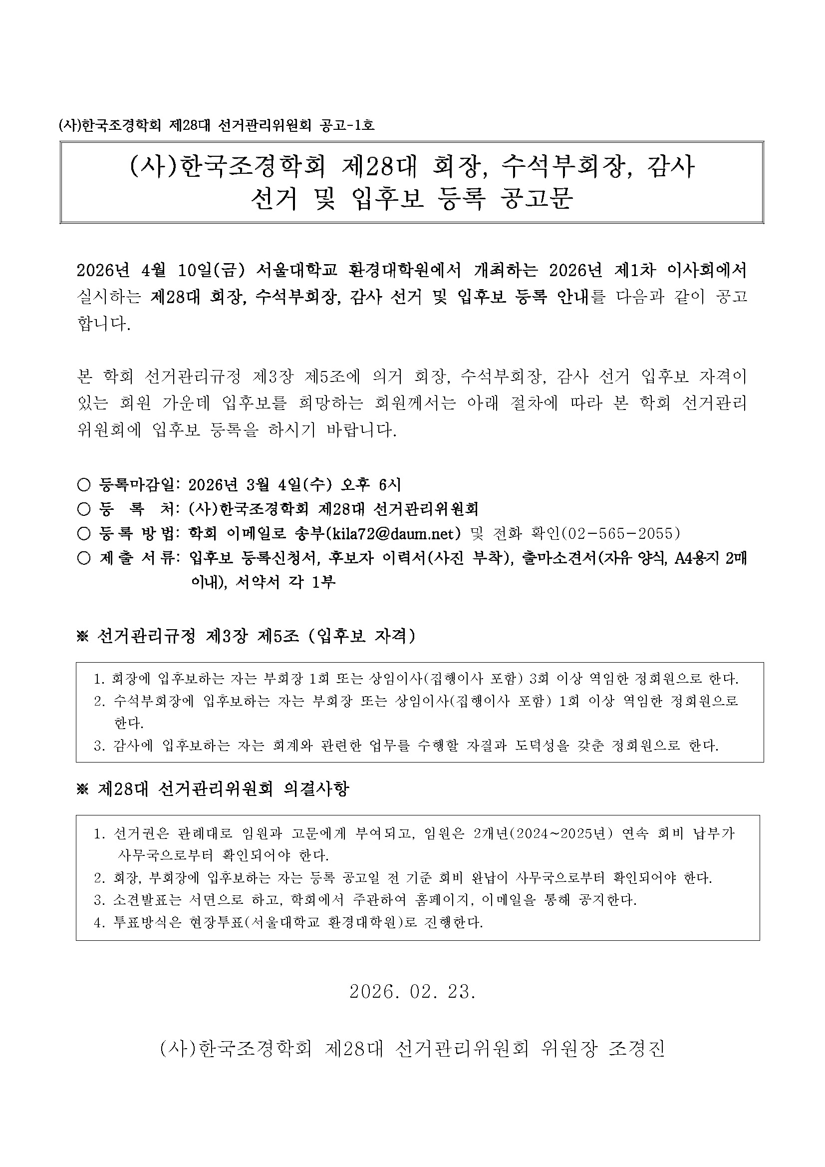 (사)한국조경학회 제28대 회장, 수석부회장, 감사 선거 및 입후보 등록 공고문