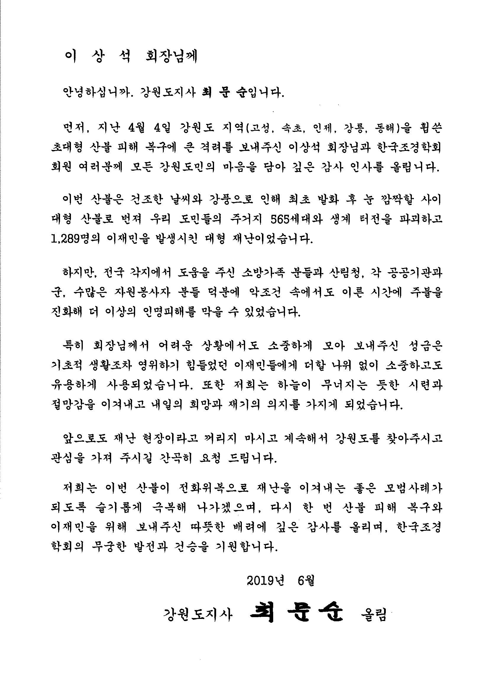 강원도 산불 성금 후원 관련 강원도지사 최문순 감사편지